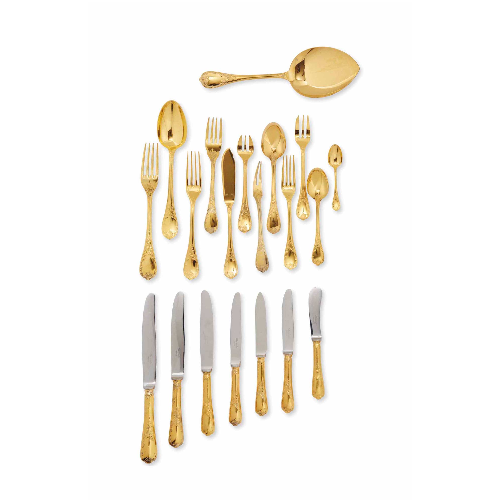 Exceptionnel service de table Christofle en métal doré comprenant couverts et ménagère complète. Orfèvrerie française de prestige témoignant du savoir-faire légendaire de la maison Christofle.