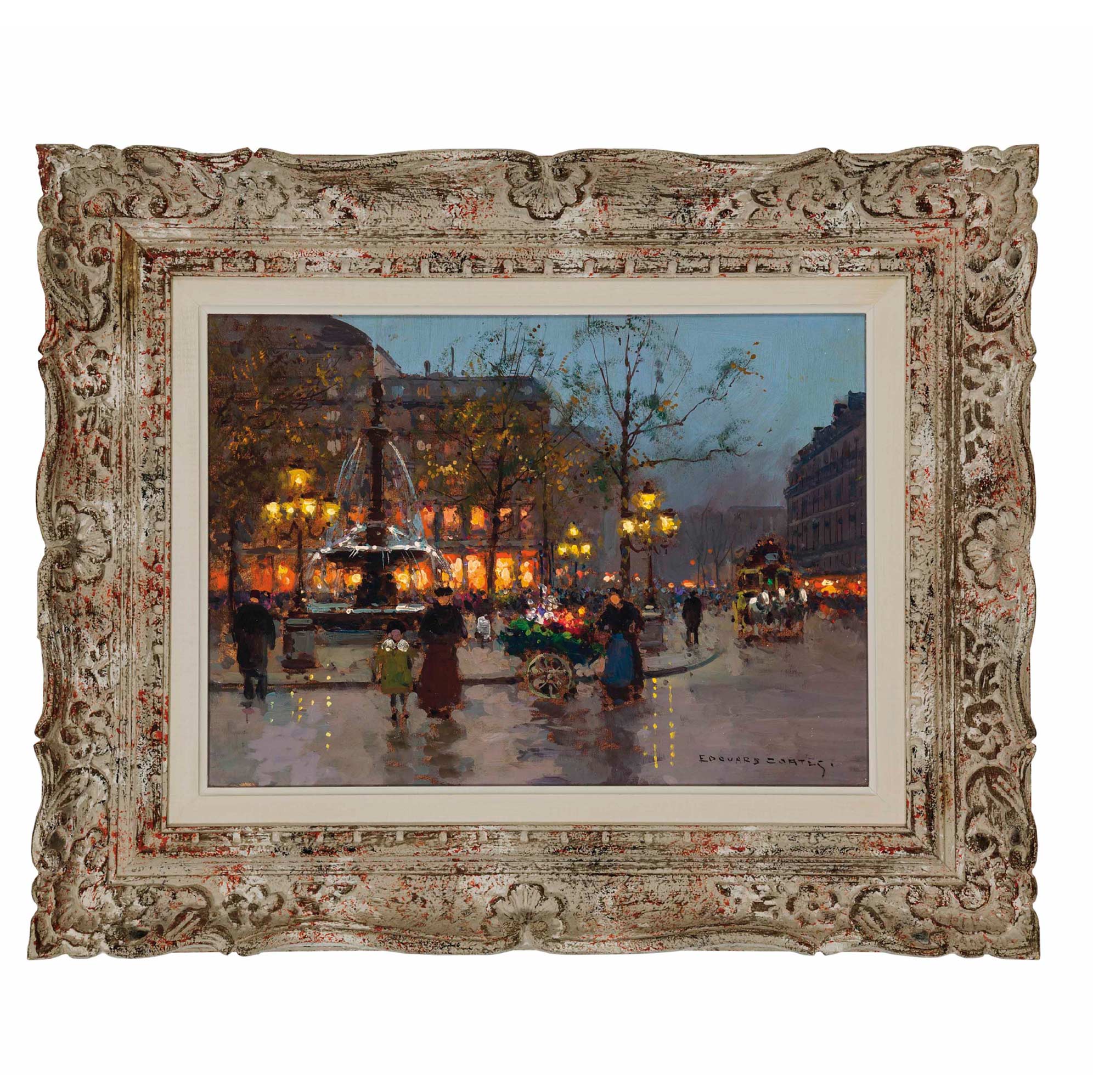 Cortès excelle dans cette composition nocturne où se mêlent l’éclairage des réverbères et des devantures illuminées. La technique impressionniste de l’artiste français capture les reflets sur le pavé mouillé et l’atmosphère vaporeuse caractéristique de Paris. Les personnages en mouvement et les voitures d’époque témoignent de la vie parisienne du début du XXe siècle. Le cadre d’époque, richement orné, met en valeur cette œuvre de l’École de Paris.