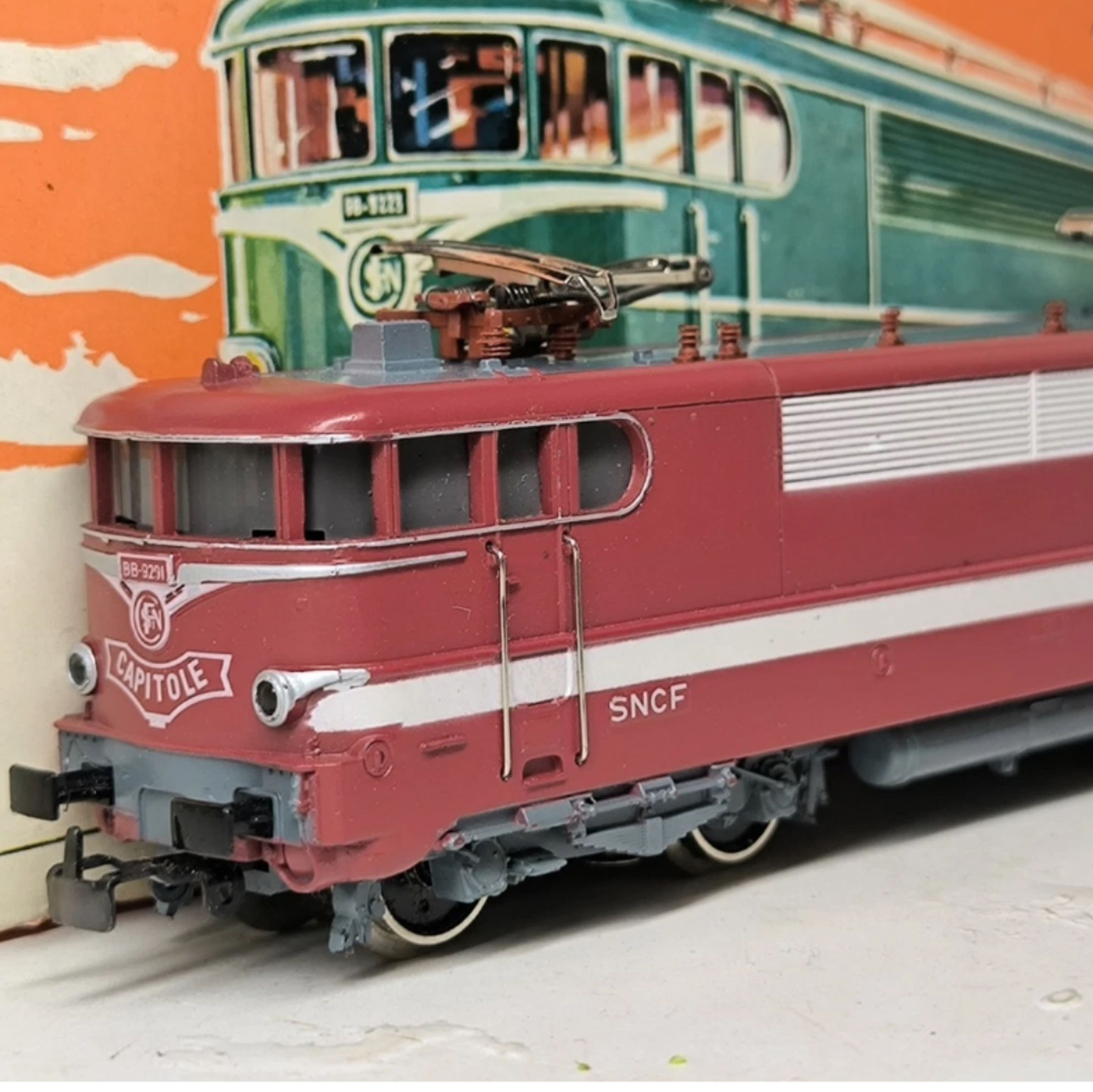 La locomotive présente un châssis métallique robuste surmonté d’une caisse aux finitions soignées. Les détails sont remarquables : pantographes fonctionnels, marquages SNCF authentiques, éclairages avant et arrière. Le moteur électrique assure une traction fluide et silencieuse caractéristique des productions Märklin de qualité muséale.